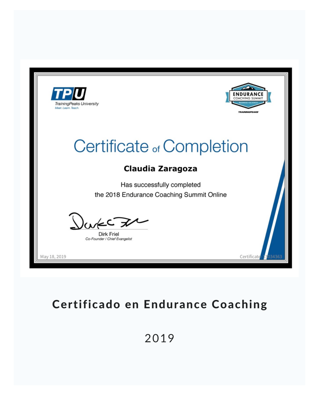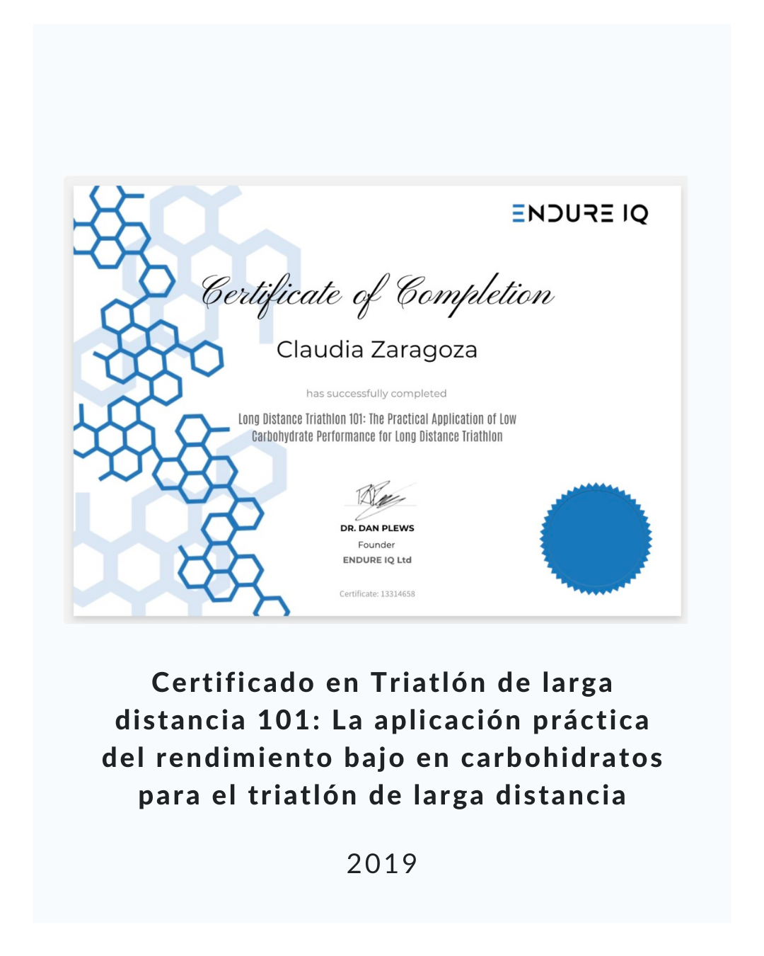 - Certificada en Endure IQ 101 & 102, cursos de fisiolog铆a de ejercicio para endurance y para la nutrici贸n de alto rendimiento, cursos creados por Dr. Dan Plews Auckland, Nueva Zelanda, 2017 y 2018.