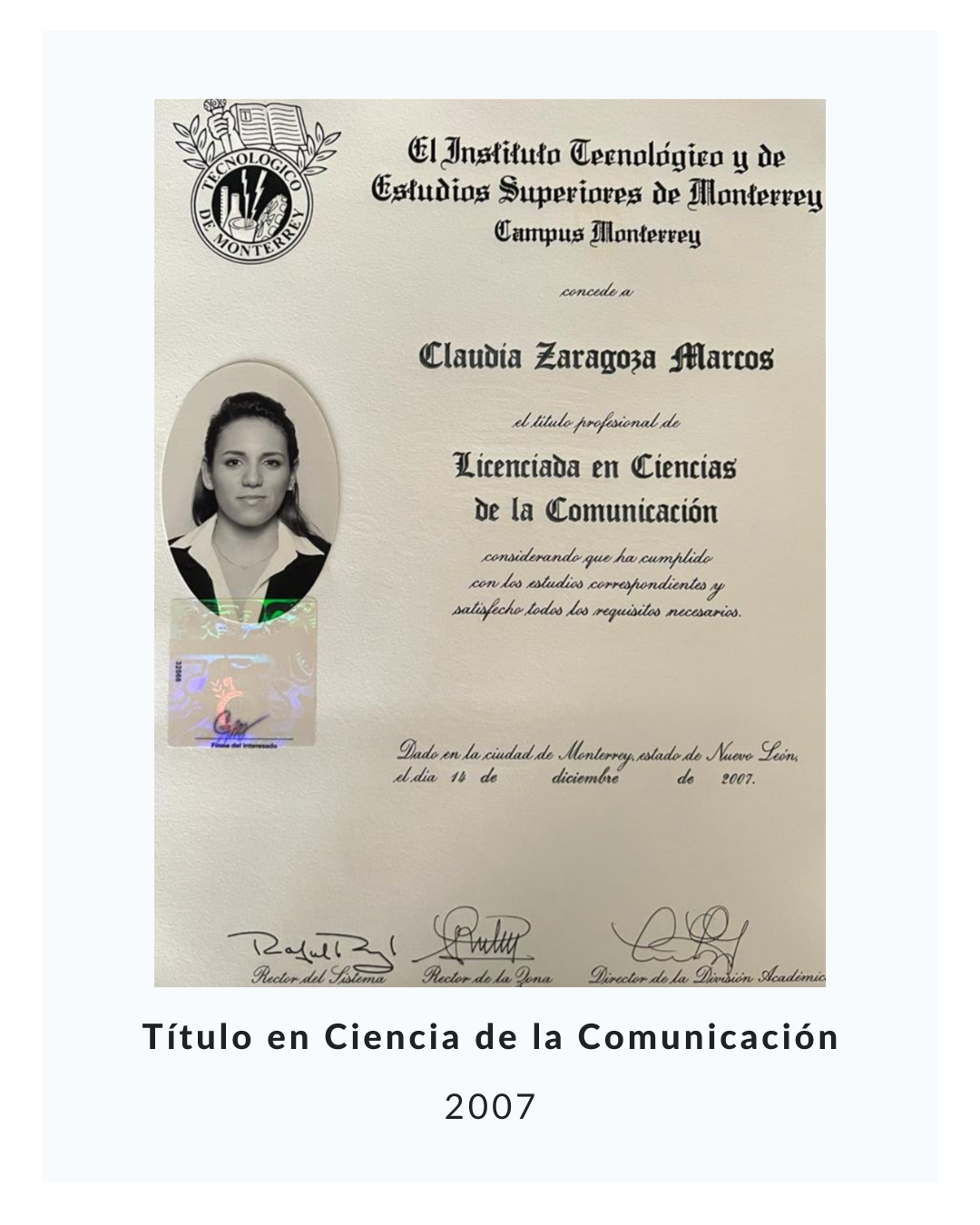 - Licenciada en Ciencias de la Comunicaci贸n con Reconocimiento Deportivo en el ITESM Campus Monterrey., 2007.